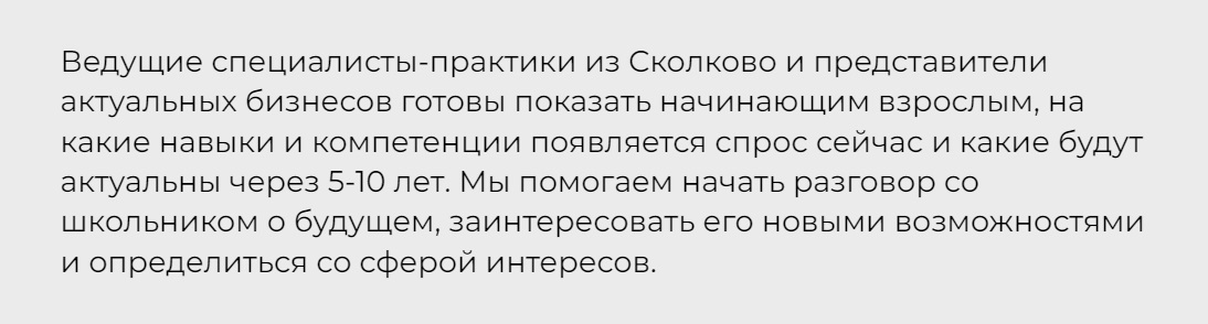 Ведущие специалисты-практики из Сколково и представители актуальных бизнесов готовы показать начинающим взрослым, на какие навыки и компетенции появляется спрос сейчас и какие будут актуальны через 5-10 лет. Мы помогаем начать разговор со школьником о будущем, заинтересовать его новыми возможностями и определиться со сферой интересов.