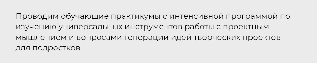 Проводим обучающие практикумы с интенсивной программой по изучению универсальных инструментов работы с проектным мышлением и вопросами генерации идей творческих проектов для подростков